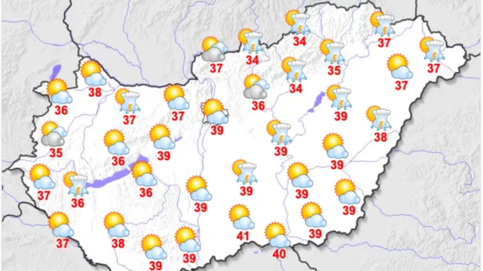 A fátyol- és gomolyfelhők mellett általában sok napsütés várható. A gomolyfelhő-képződés erőteljessé válhat, és elszórtan – nagyobb számban az ország északi felén – alakulhatnak ki záporok, zivatarok, amelyeket lokálisan intenzív csapadék és erős vagy viharos erejű széllökés kísérhet. A zivataroktól függetlenül legfeljebb megélénkül a délire, délkeletire forduló szél. A legmagasabb nappali hőmérséklet 34 és 41 fok között várható, legmelegebb az Alföldön lesz. Késő estére is csak 25 és 33 fok közé csökken a hőmérséklet.